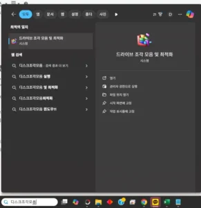 - ✔️ 검색창에 디스크 조각 모음 또는 드라이브 최적화 입력